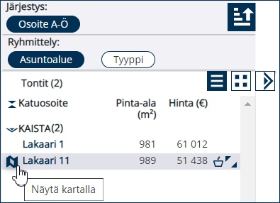 Voit avata tontin tarkemmat tiedot tonttikortille napsauttamalla kadunnimeä tonttien selailussa.